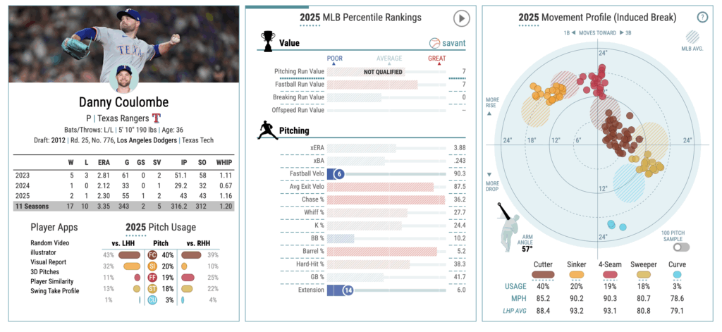 Coulombe performed well before arriving in Texas with a 1.16 ERA in 41 innings with 9 walks compared to 31 strikeouts. This all came out to a 1.6 WAR.